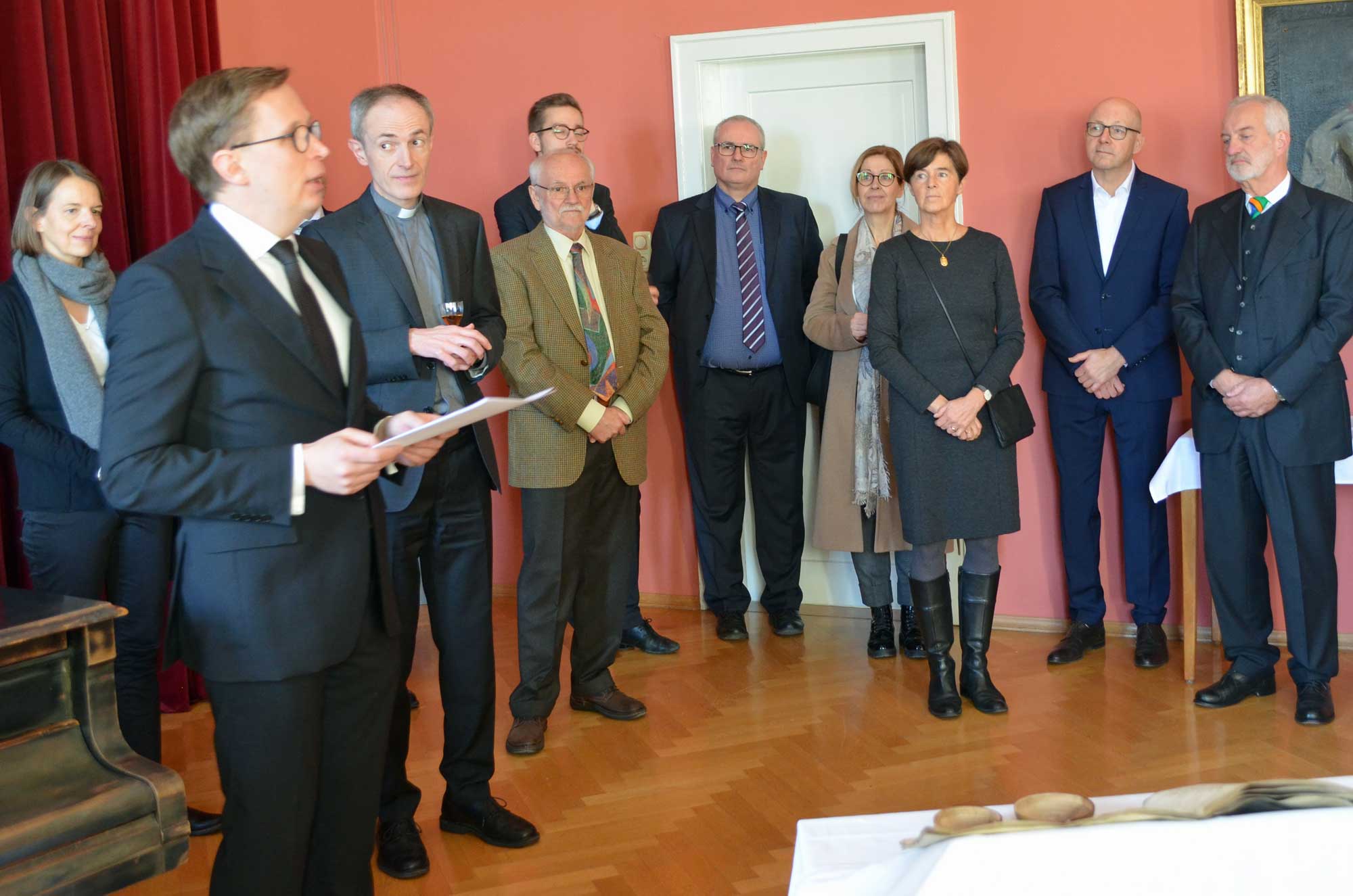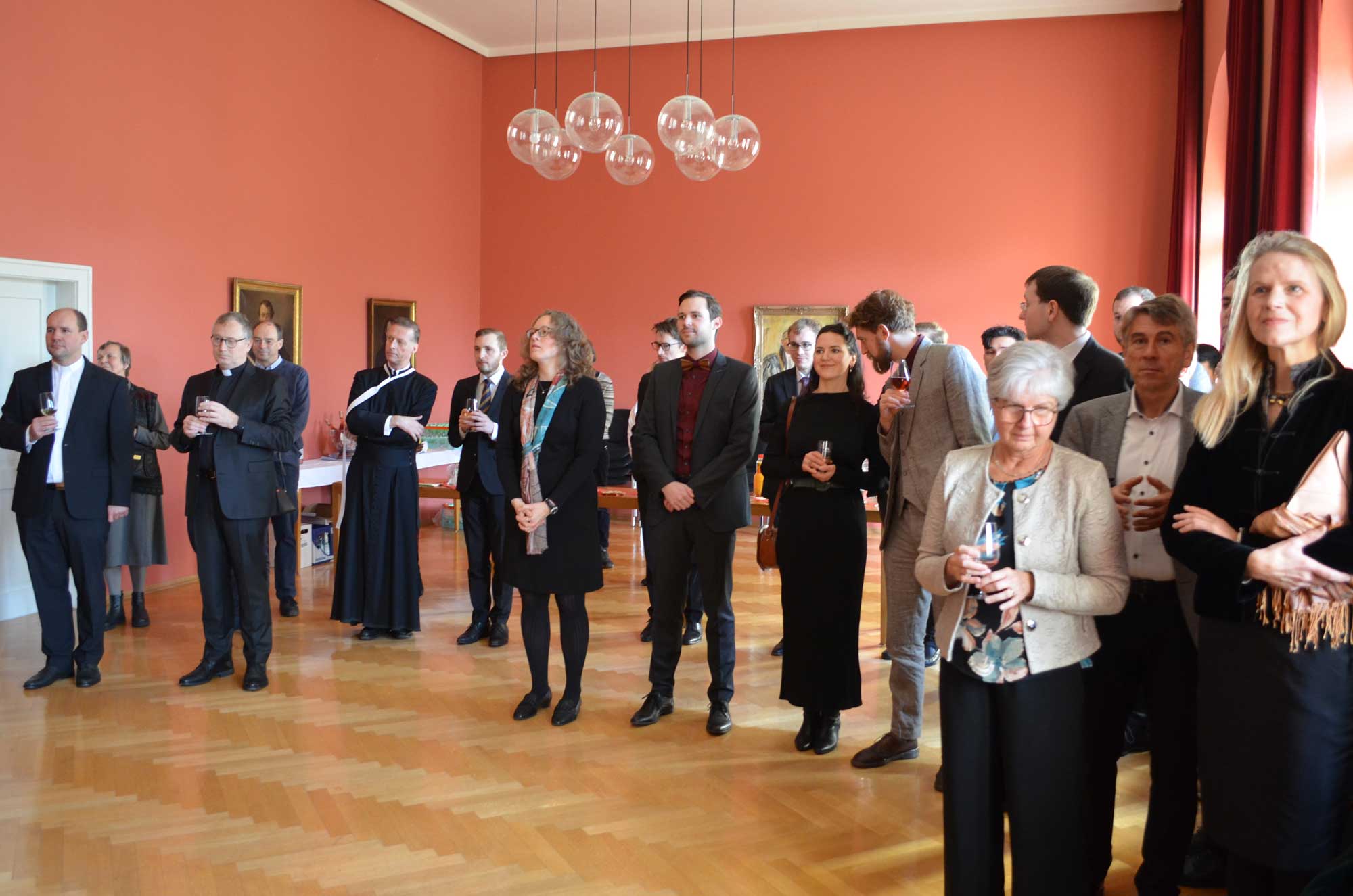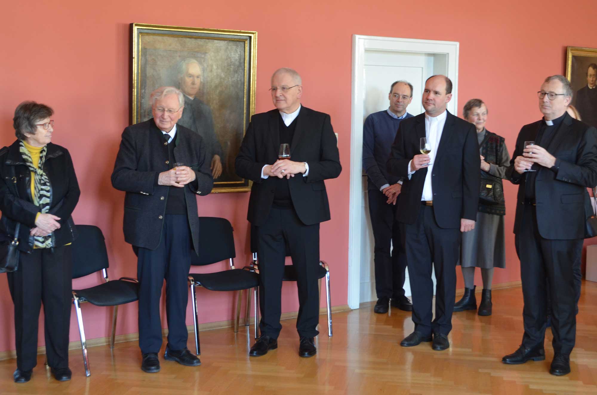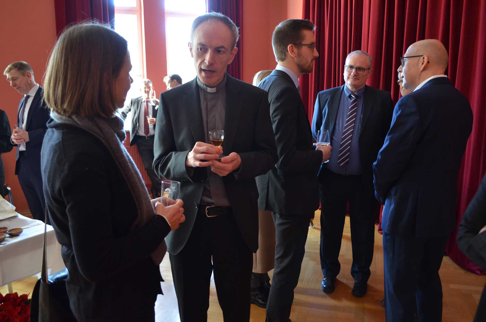 Beim anschließenden Empfang in der Aula blickte der Stiftungsdirektor des Herzoglichen Georgianums, Prof. Dr. Stefan Kopp, kurz zurück auf die wichtigsten Ereignisse im 529. Jahr des Kollegs, das 1494 von Herzog Georg dem Reichen aus dem Hause Wittelsbach begründet wurde. Wiederholt nahm Kopp dabei Bezug auf seinen Vorgänger, geschätzten Lehrer und väterlichen Freund Prof. Dr. Winfried Haunerland, der im August 2023 nur ein Jahr nach seiner Verabschiedung nach schwerer Krankheit verstorben ist. Zugleich entfaltete er sein Verständnis von der Weiterentwicklung der Einrichtung der Priesteraus- und ‑fortbildung, zu deren Mitarbeitenden neu Assistentin Irena Dreyer-Filbrandt, Referentin Barbara Brunnert und Spiritual Michael Dotzauer gehören.