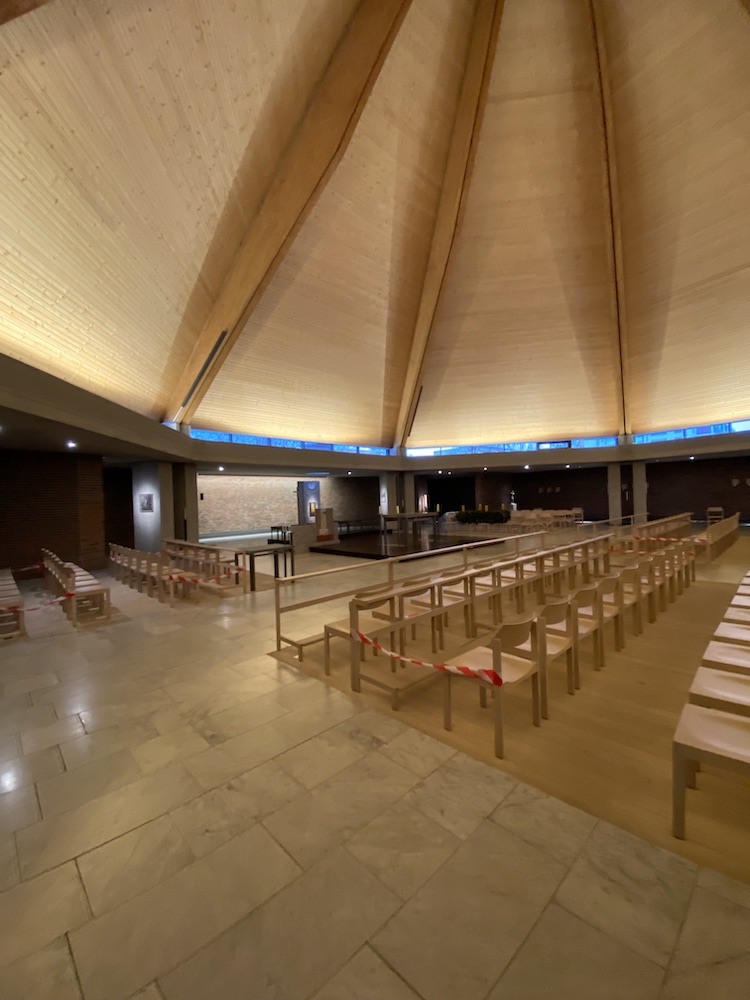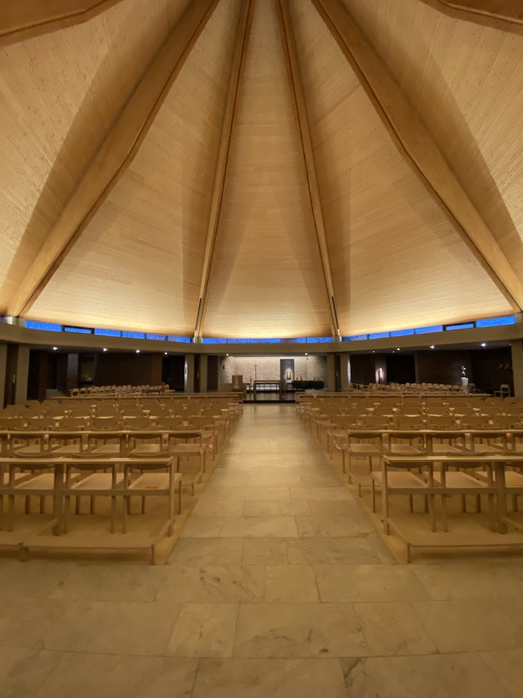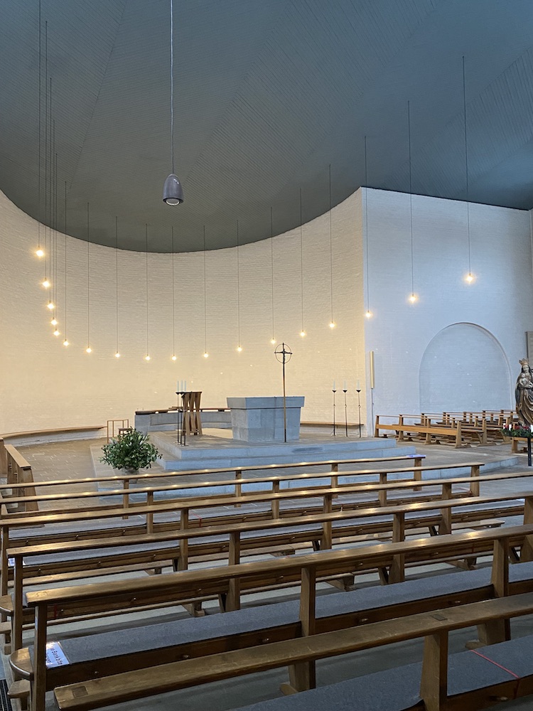 In den aktuellen Diskussionen um die „Kirche im Umbruch“ – unserem Semesterthema – wird diese oft als aus der Zeit gefallen, antiquiert und einsturzgefährdet empfunden. Vor diesem Hintergrund machten wir uns an diesem Wochenende unter der fachkundigen Führung von Dr. Andreas Heisig auf, um eine Reihe moderner Kirchenbauten in München zu besichtigen. Den Anfang machte die „St. Laurentius“ Kirche, die in ihrer gesamten Anlage den Geist der experimentierfreudigen liturgischen Bewegung atmet und damit bereits bei ihrer Weihe 1955 ganz im Zeichen des 2. Vatikanums steht: Der äußerlich schlichte Scheunenbau leitet den gutbürgerlichen Besucher schon beim Betreten zu einer inneren Umwendung an, um für das Außergewöhnliche empfänglich zu werden und Christus auf der mitten in die Gemeinde hineinschwingenden Altarinsel begegnen zu können. Dieses Erlebnis vermittelt auch die 1962 geweihte „St. Nikolaus“ Kirche, die mit ihrem weit aufgespannten Zeltdach nicht nur alle Katholiken zur direkten Begegnung mit Gott einlädt, sondern als Teil eines ökumenischen Ensembles darüber hinaus die Nähe zu den protestantischen Geschwistern sucht. Gerade im unter vielen sozialen Konflikten leidenden Hasenbergl lädt auch „Mariä Sieben Schmerzen“ mit einem äußerlich bescheidenen Bau alle Gott Suchenden in sein weites Zelt der Begegnung ein – zu geistlicher Stärkung wie zum Mittagstisch für Bedürftige. Zum Abschluss unserer Kirchentour empfing uns schließlich „Herz Jesu“ in Neuhausen mit ihren sich weit und herzlich öffnenden riesigen Pforten.