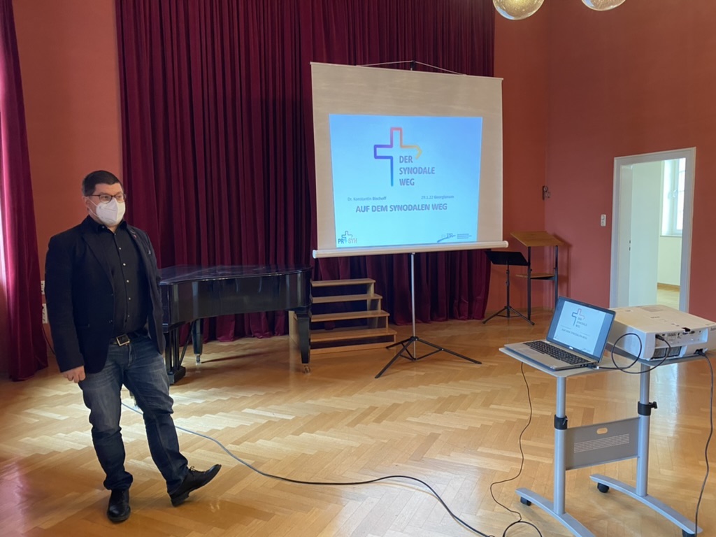 Von manchen skeptisch oder distanziert beäugt, von anderen als letzte Hoffnung sehnsüchtig erwartet – bedeutsam ist der synodale Weg zweifellos für alle von uns, die wir eine Berufung zum Dienst in der Kirche verspüren. Mit dem Besuch von Konstantin Bischoff bot sich nun die Gelegenheit, von einem Synodalen Eindrücke aus erster Hand zu erhalten. Sein Vortrag rief mit der MHG-Studie die „Geburtsumstände“ des synodalen Wegs in Erinnerung und skizzierte anhand von zahlreichen Anekdoten die Strukturen und den Verlauf dieses kirchenrechtlichen Novums.