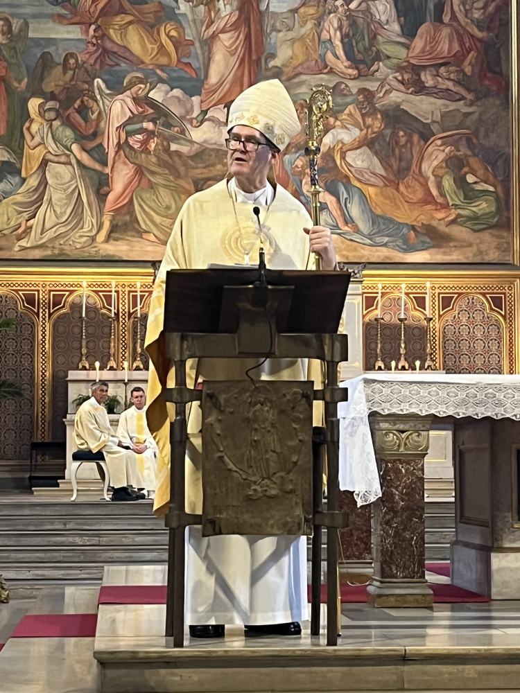 So nahm der Regensburger Weihbischof Dr. Josef Graf in seiner Predigt nach kurzer Einleitung die konkreten Zeitumstände des priesterlichen Dienstes der Jubilare nüchtern in den Blick: „Das Priestertum ist das Sturmzentrum der Kirchenkrise“ (https://www.communio.de/inhalte.php?jahrgang=2022&ausgabe=1&artikel=2), der Priesterberuf sei ein Beruf in der Krise und nicht mehr attraktiv, die Lage sehr ernst. Denn angesichts des Glaubensschwunds und des zurückgehenden kirchlichen Lebens fehle das Umfeld des gelebten Glaubens, in dem der priesterliche Dienst wertgeschätzt werden könne. Zunächst einmal gelte es, diese Wirklichkeit schonungslos in den Blick zu nehmen, um sich sodann neu auf das zu besinnen, was das Evangelium verkünde (Joh 14,23-26) und den Priester eigentlich ausmache: das Festhalten an Gottes Wort, die Pflege der innigen Beziehung zu Christus und damit der Innenseite des Priesterberufs wie des ganzen kirchlichen Lebens. Ohne diese Basis drohe der Priester bloß die Außenseite mit Erfolgen, Karriere und Ansehen aufzupolieren. Wie zuvor in der Lesung (1 Petr 4,7-11) gehört, gehe es stattdessen darum, „einander als gute Verwalter der vielfältigen Gnade Gottes, jeder mit der Gabe, die er empfangen hat“ zu dienen und so das mit leeren Händen Empfangene weiterzugeben. Mit Blick auf das hohe Maß an empfangenen Gaben erinnerte Graf die Jubilare an ihre besondere Rechenschaftspflicht, ermutigte sie aber auch zu Zuversicht und Gelassenheit im Angesicht von Gottes Gnade.
