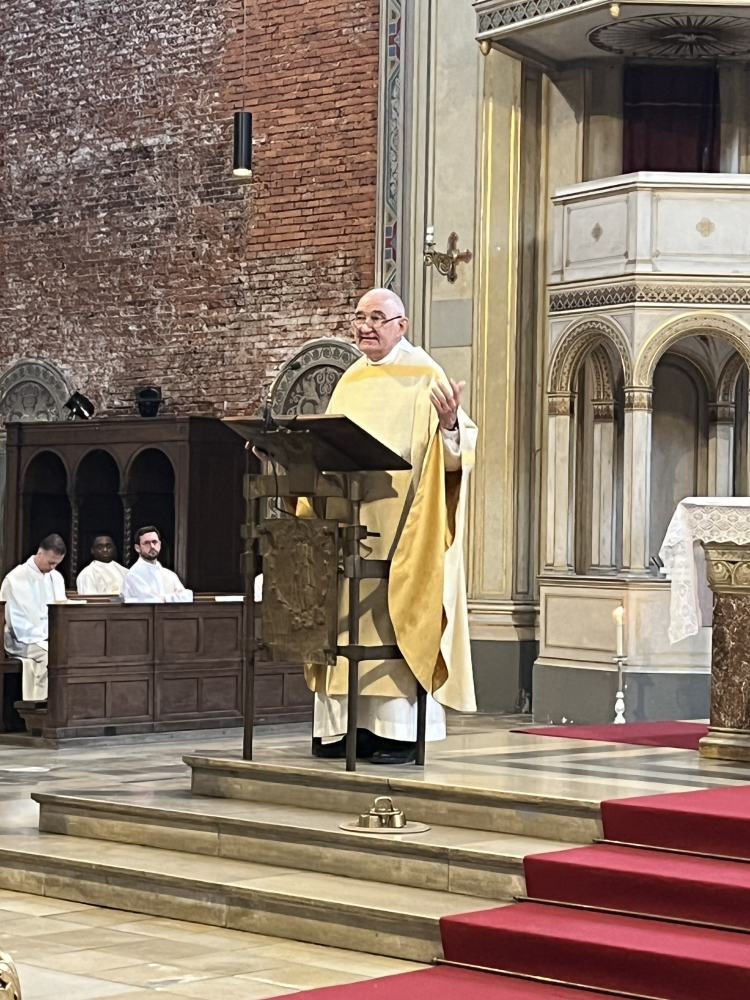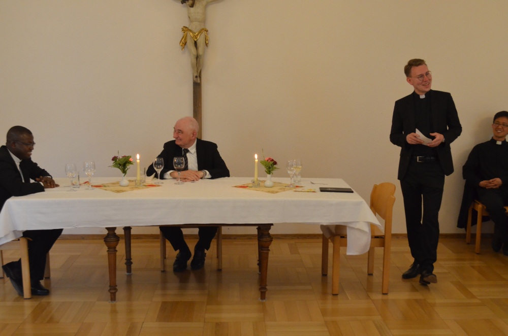 In der Hausgemeinschaft erfreuten wir uns am Sonntag an einem weiteren Festmahl. Nach der abschließenden feierlichen Ansprache von Subregens Staude ließ Direktor Haunerland es sich nun aber doch nicht nehmen, angesichts des einsetzenden Donnergrollens an die römische Wetterlage bei der Verkündigung des Unfehlbarkeitsdogmas zu erinnern – vielleicht würde diese Form von selbstironischem Humor auch den heutigen kirchlichen Unwettern ein wenig ihre Spannung nehmen…
